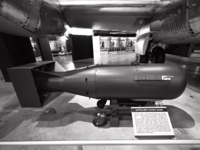 A model of Little Boy located at Wendover Historic Airfield, in Utah, on the California border. The base, once neglected, is now being restored. This model, made by John Coster-Mullen, is considered one of the most accurate and is a centerpiece of the historical base, though the weapon was never here. Wendover was where the crews of the B-29s practiced dropping the bomb.