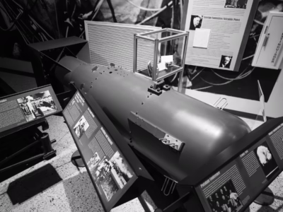 An image from the new galleries at the K-25 History Center at Oak Ridge, Tennessee, the site where uranium was purified for use in Little Man and for further processing into plutonium in Washington state. The display emphasizes the many other locations (in addition to the famous Los Alamos) that worked on developing the bomb.