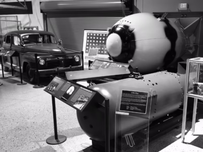 A small model of the Fat Man (or Mark III) sitting incongruously upright, upon its stabilizer. The plane tail in the image is a model of the B-58 Hustler, a supersonic bomber. As the Fat Man design was phased out before 1950 before the arrival of the B-58 Hustler, it seems unlikely that this plane carried this particular bomb. The small object that the figure is looking at appears to be one of the plane’s escape pods. Located at the Grissom Air Museum at Grissom AFB.