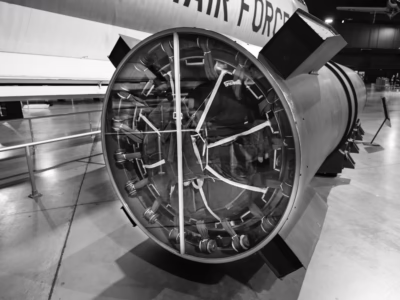 The Mark-17 was the physically largest nuclear bomb ever produced by the United States. Here it is placed against the backdrop of the enormous B-36, the only plane capable of carrying it. Located at the National Museum of the US Air Force, in Dayton, Ohio.